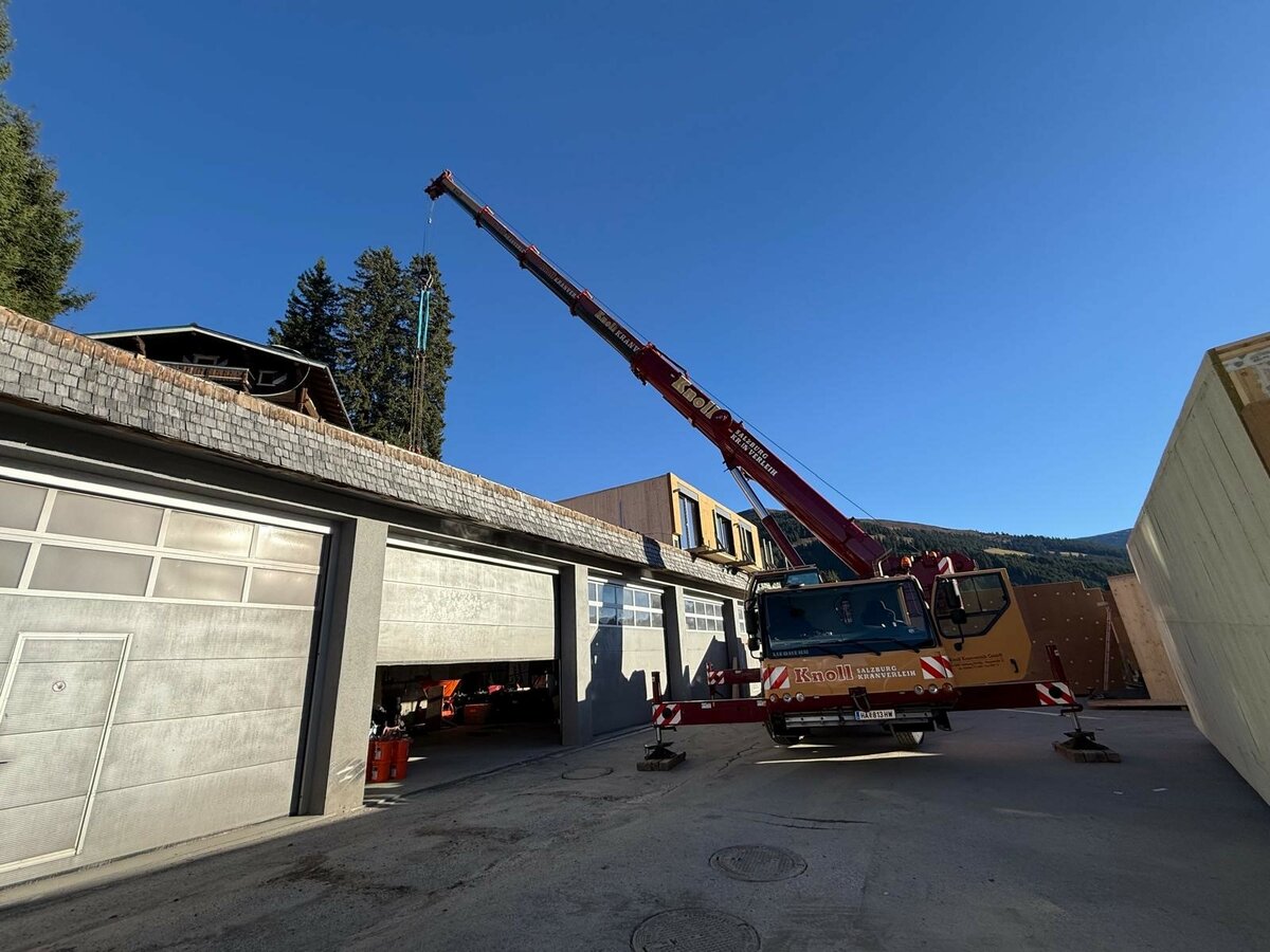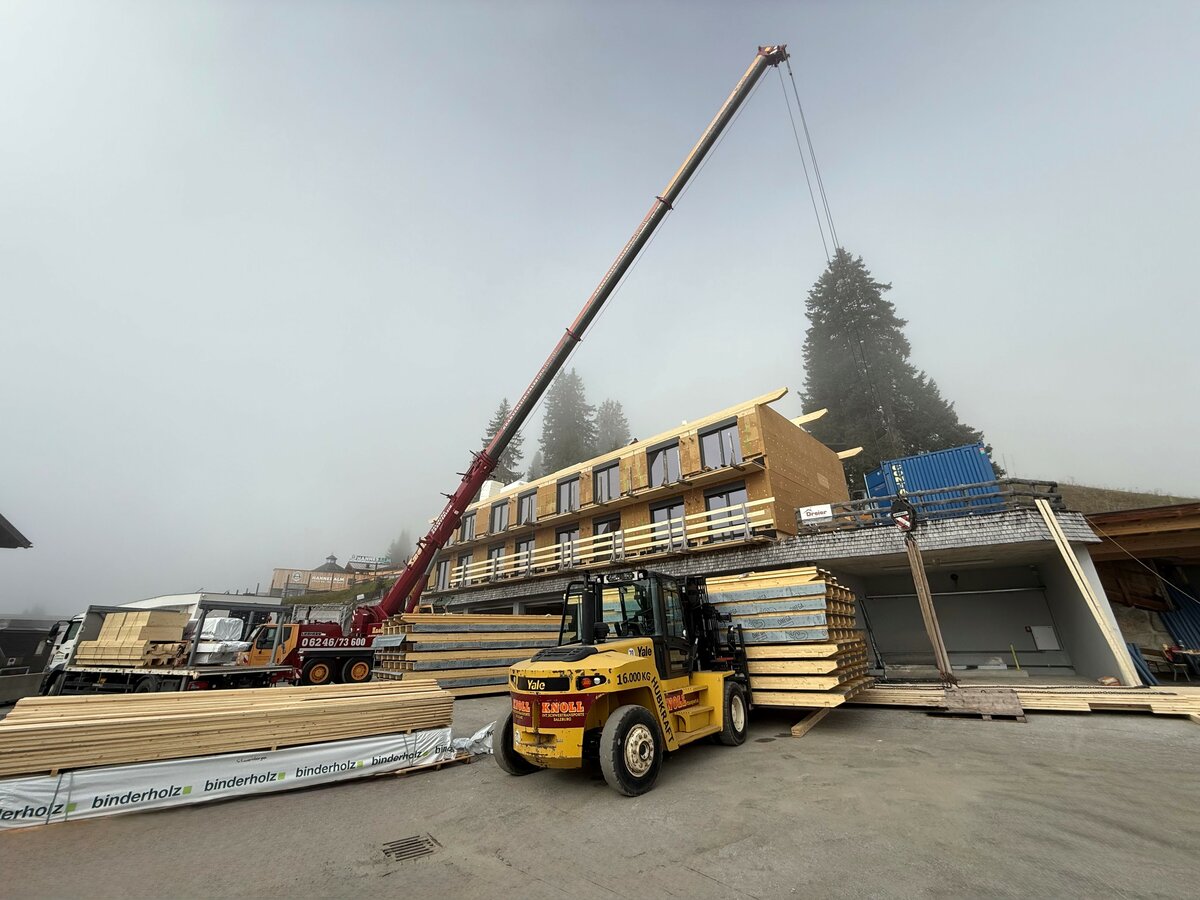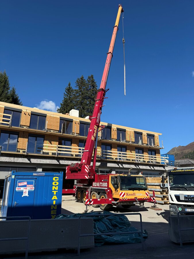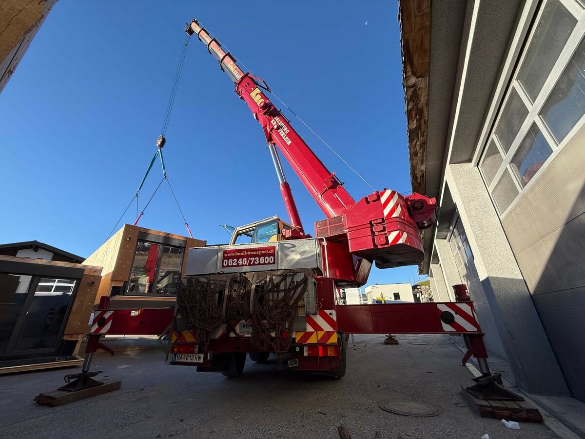 Mit Hilfe unseres 16 to Staplers wurden die Raumzellen zunächst zur Zwischenlagerung vom Transportfahrzeug gehoben und anschließend mit unserem 70 to Teleskopkran präzise an ihren endgültigen Platz versetzt.